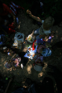 Tam buğday ekmeklerimizi de alıp yine düştük yollara.Yarım saatlik bir tırmanış veee Menekşedeyiz. Ne denir,nasıl tarif edilir bilemiyorum.Yeşil sarınca insanın etrafını başka hissediyormuş insan,hele çıkartıp ayakkabıyı çorabı basınca toprağa ohhhh (yazarken bile ferahladı içim). Çadırlar kuruldu,yiyecekler hazırlandı ve çocuklarla birlikte Alpay'ın refakatinde ormana, Ayı Winninin klübesini aramak için yürüyüşümüze başladık. Çocuklar önde biz arkada yürüyoruz ama aslında arkada olmak çokta işimize gelmiyor çünkü; Alpay'ın çocuklara anlattığı hikayeleri çok merak ediyoruz. Bir süre sonra mis gibi kekik kokuları doluyor genzimize, biraz yorulmuşuz, oturduk Denizle yamaçta hem ormanı hem gülen koşan çocuklarımızı seyrettik.